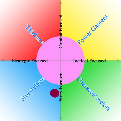 My interpretation of that data is that we, TI, are more in the Storyteller quadrant. Some people play characters more in the Character Actor quadrant. I put a dot where I think TI fits on the map.