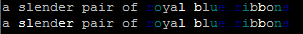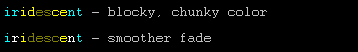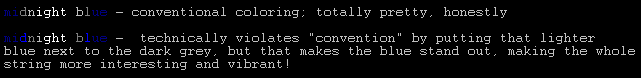You see in the example above how dark color is by far the majority of the string - that makes it easier to read. It also makes the transition just feel smoother to have minimal amounts of bright color, especially since the shifts usually occur in the brights - too many dark colors next to each other tend to look muddy.