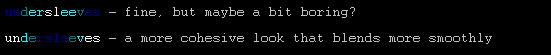 Color without accent vs. color with accent: The bright white on the second "slender" is barely noticed, but when you have a full outfit block (really only applies to tailors) and only a couple words per string that could be feasibly colored, having something subtle to break it up is kinda nice. Wouldn't recommend using anything but gray or bright white for it, though, as it can get too busy in a hurry.