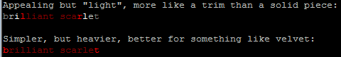 I've done some unusual things like running patterns through an entire outfit, with the colors working off the "block" rather than individual words or phrases, but in the end I always end up back on the latter. Dice's method is clean, and if you're a crafter people are a lot more likely to buy your stuff if you use word/phrase coloring in the way described above me.