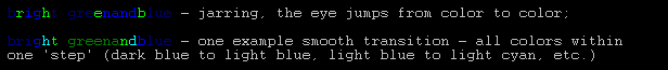 In other words, if you want to make something that incorporates both blue and green, don't put bright green next to dark blue. Create a smooth, gradual fade instead.
