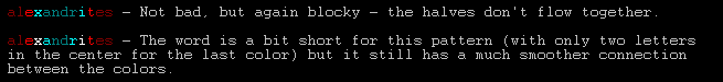 Also, if you're using light colors to make transitions between multiple colors like in the previous example, go ahead and try only one letter of each light color at a time. This makes the fade sharper and prettier.