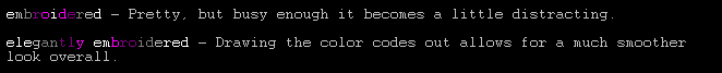 I've done some unusual things like running patterns through an entire outfit, with the colors working off the "block" rather than individual words or phrases, but in the end I always end up back on the latter. Dice's method is clean, and if you're a crafter people are a lot more likely to buy your stuff if you use word/phrase coloring in the way described above me.