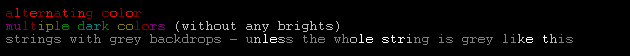 You see in the example above how dark color is by far the majority of the string - that makes it easier to read. It also makes the transition just feel smoother to have minimal amounts of bright color, especially since the shifts usually occur in the brights - too many dark colors next to each other tend to look muddy.